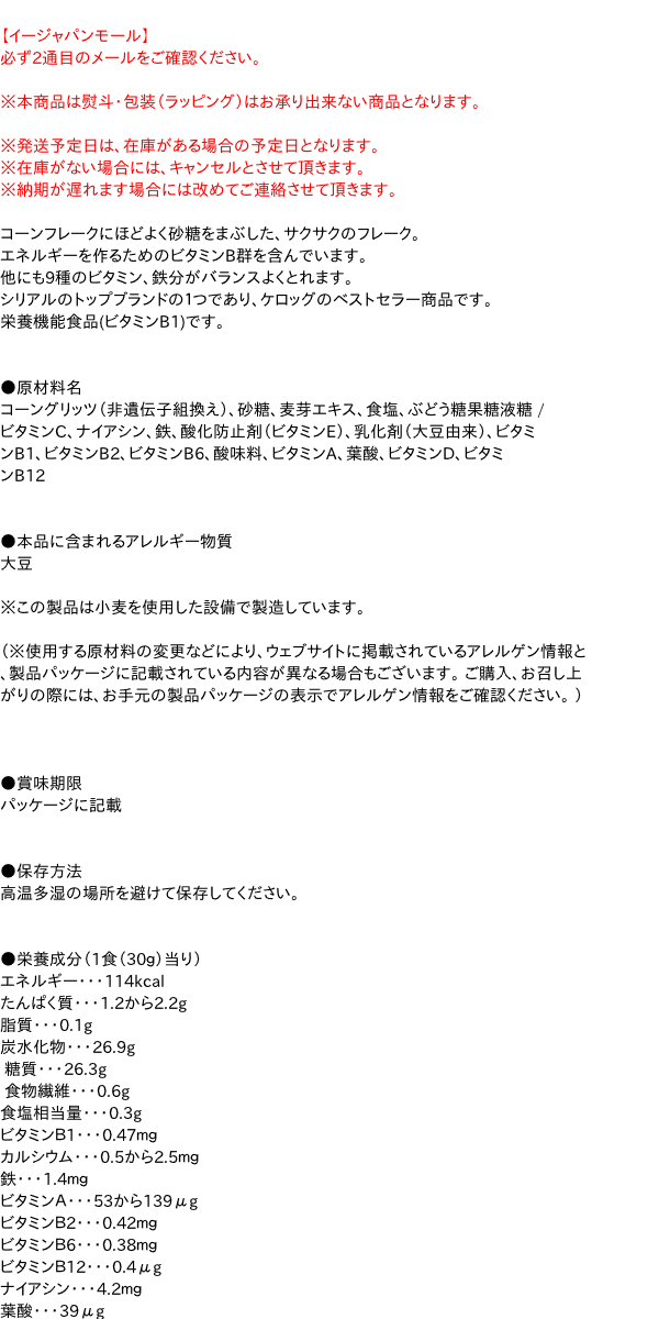 ●栄養成分(1食(30g)当り) エネルギー・・・114kcal たんぱく質・・・1.2から2.2g 脂質・・・0.1g 炭水化物・・・26.9g 糖質・・・26.3g 食物繊維・・・0.6g 食塩相当量・・・0.3g ビタミンB1・・・0.47mg カルシウム・・・0.5から2.5mg 鉄・・・1.4mg ビタミンA・・・53から139μg ビタミンB2・・・0.42mg ビタミンB6・・・0.38mg ビタミンB12・・・0.4μg ナイアシン・・・4.2mg 葉酸・・・39μg ビタミンC・・・15mg ビタミンD・・・0.59から1.53μg 240g×6個【商品区分】栄養機能食品【メーカー・製造または販売元】日本ケロッグ合同会社0120-500209【原産国】日本【広告文責】株式会社イージャパンアンドカンパニーズ 072-875-6666《ご注意ください》 ※商品がリニューアルしている場合、リニューアル後の商品にてお届けとなる場合がございます。